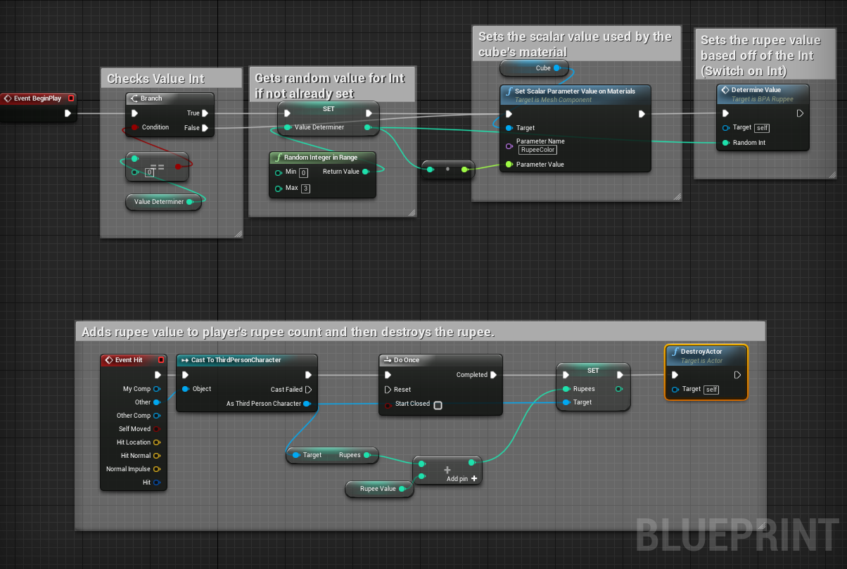 The rupees follow the same general color and value scheme as can be found in Zelda games (Green = 1, Blue = 5, etc…). I actually have the rupees determining this value themselves via setting a number to a random float value and setting the rupee worth and color based off of the result in comparison to set bracket values. However, this can be overridden by manually setting this public value prior to hitting the “play” button, which is the only way to get a rupee value over 50.